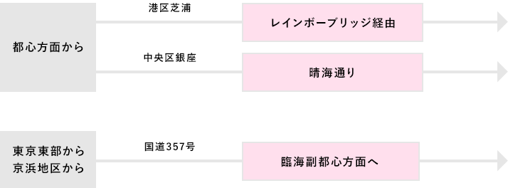 新橋駅から、レインボーブリッジを渡って臨海副都心の主要地区を結んでいる「ゆりかもめ」と、新木場と大崎間を結び、臨海副都心の地下を東西に貫く「りんかい線」があります。